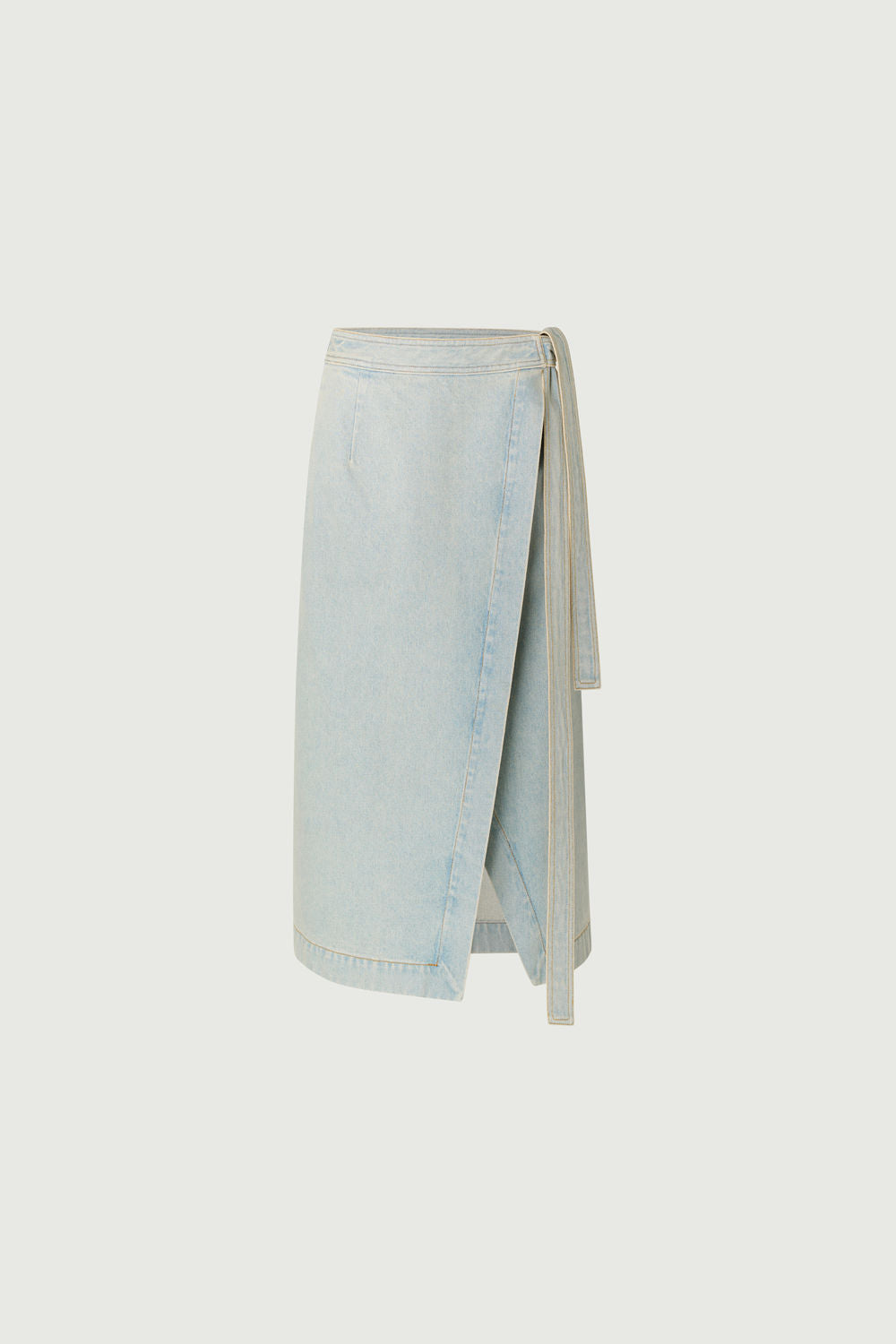 BLONDIE is a wrap denim skirt. Its elegant mid-calf length cut enhances the silhouette while providing comfortable freedom of movement.