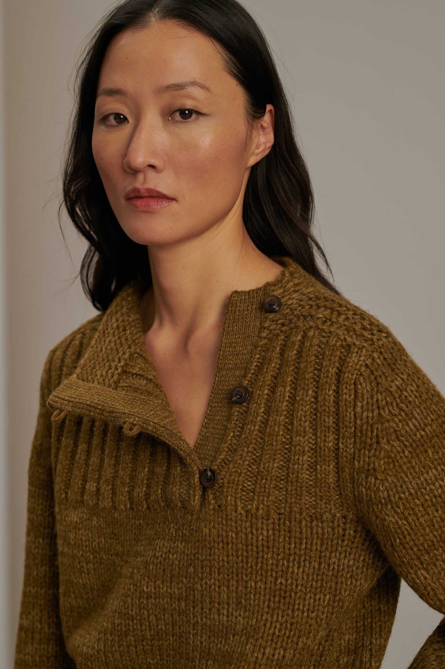 BISCAROSSE is a long-sleeve jumper, knitted from a marled virgin wool yarn. Crafted in a thick yet airy knit, it’s both flexible and comfortable. A buttoned opening at the front allows a side neckline to be revealed. Through a ribbed visual effect, the colour appears marled in shades of khaki and bronze.